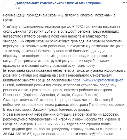 "В случае возникновения опасных ситуаций, угрозы жизни или здоровью, рекомендуем звонить на "горячую линию" Посольства Украины в Греции по телефону +30 69327656 06, адрес электронной почты emb_gr@mfa.gov.ua, или на круглосуточную "горячую линию" МИД Украины: + 38044238 16 57, адрес электронной почты cons_or@mfa.gov.ua", - сообщили дипломаты.
