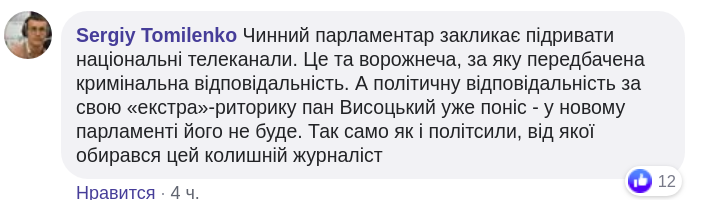 Коллегу поддержал Сергей Томиленко - председатель Национального союза журналистов Украины. В комментариях к посту он написал: "Это вражда, за которую предусмотрена уголовная ответственность. А политическую ответственность за свою "экстра"-риторику господин Высоцкий уже понес - в новом парламенте его не будет. Так же как и политсилы, от которой избирался этот бывший журналист".