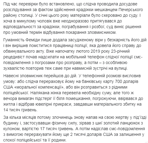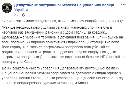 В Киеве неоднократно судимый житель Печерского района решил отомстить следователю, которая вела его дело. Он угрожал, шантажировал, а затем и ограбил женщину. Рецидивист задержан и помещён в СИЗО, передает Департамент внутренней безопасности НП Украины в соцсети.