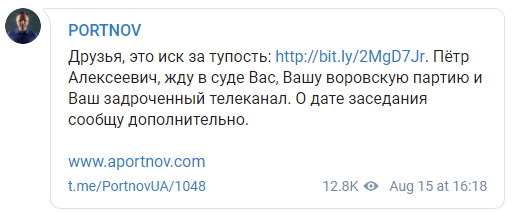 "Друзья, это иск за тупость: http://bit.ly/2MgD7Jr. Пётр Алексеевич, жду в суде Вас, Вашу воровскую партию и Ваш задроченный телеканал. О дате заседания сообщу дополнительно", - написал Портнов.