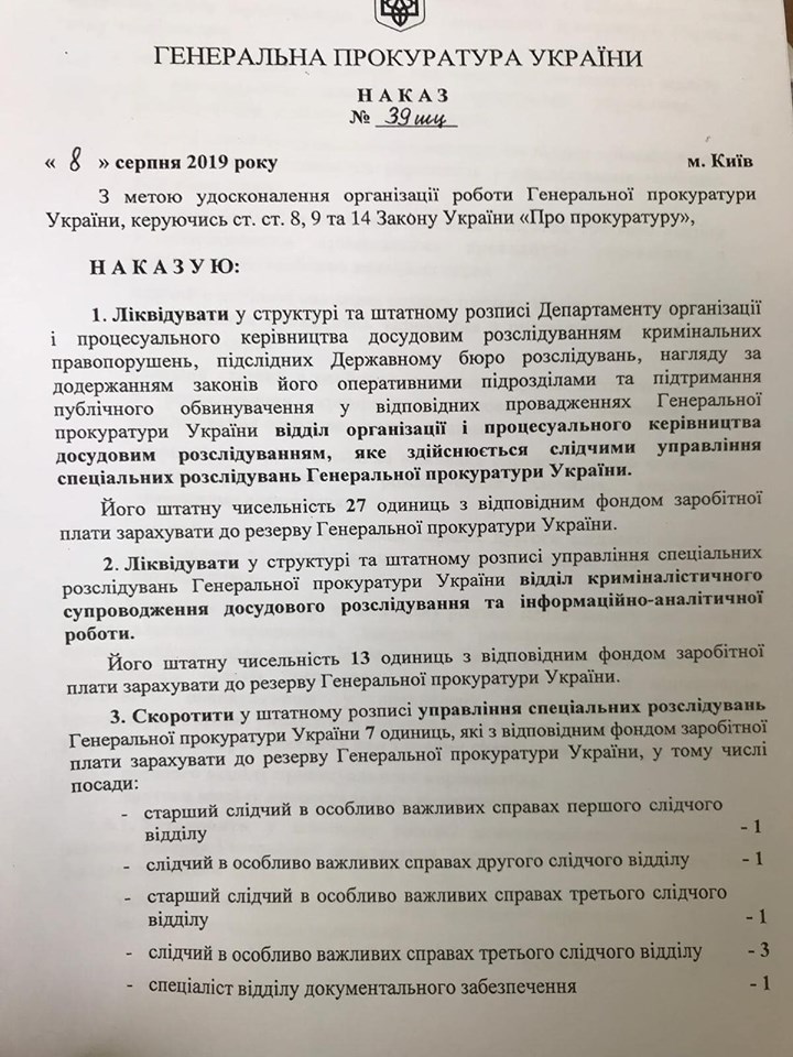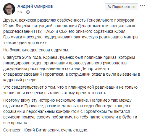 "8 августа 2019 года, Юрием Луценко был подписан приказ, которым ликвидирован отдел организации процессуального руководства досудебным расследованием в составе Департамента спецрасследований Горбатюка, а сотрудники отдела были выведены в кадровый резерв", - написал Смирнов.