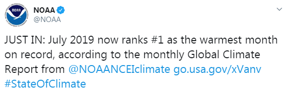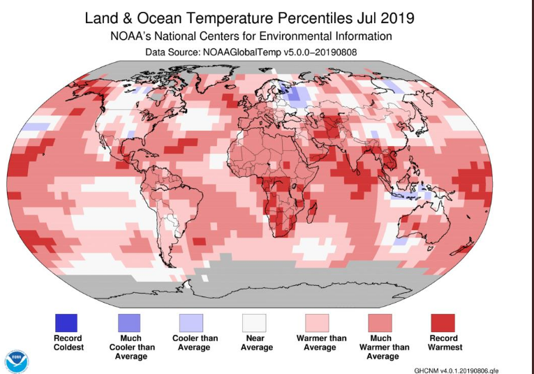 Июльская арктическая жара является частью более широкой глобальной тенденции, обусловленной глобальным потеплением вследствие загрязнений. Данные NOAA подтвердили, что июль был самым жарким месяцем на Земле в истории метеонаблюдений, когда температура была на 0,95 градуса по Цельсию выше среднего уровня XX века. Климатолог Роберт Роде заявил, что есть 90% вероятность, что 2019 год станет вторым самым жарким за всю историю наблюдений, отставая только от 2016 года.