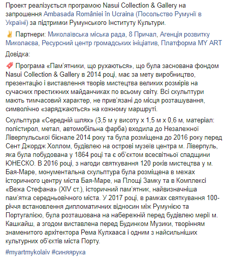 Уточняется, что таким образом Николаев присоединится к международному проекту "Moving Monuments/Движущиеся памятники". В его рамках скульптура путешествует по миру, символизируя таким образом дружбу и общению. "Синяя рука" уже побывала на центральных площадях в разных городах Европы. Так, ее выставляли в Великобритании, Румынии, Португалии и Киеве. В Николаеве скульптура будет установлена ​​на набережной "8 Причал" во время старта образовательно-художественной программы "Дни современного искусства в Николаеве".