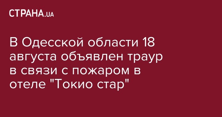 В воскресенье, 18 августа, в Одесской области объявлен траур по жертвам пожара в гостинице "Токио стар". Соответствующее распоряжение опубликовано на сайте Одесской областной госадминистрации.