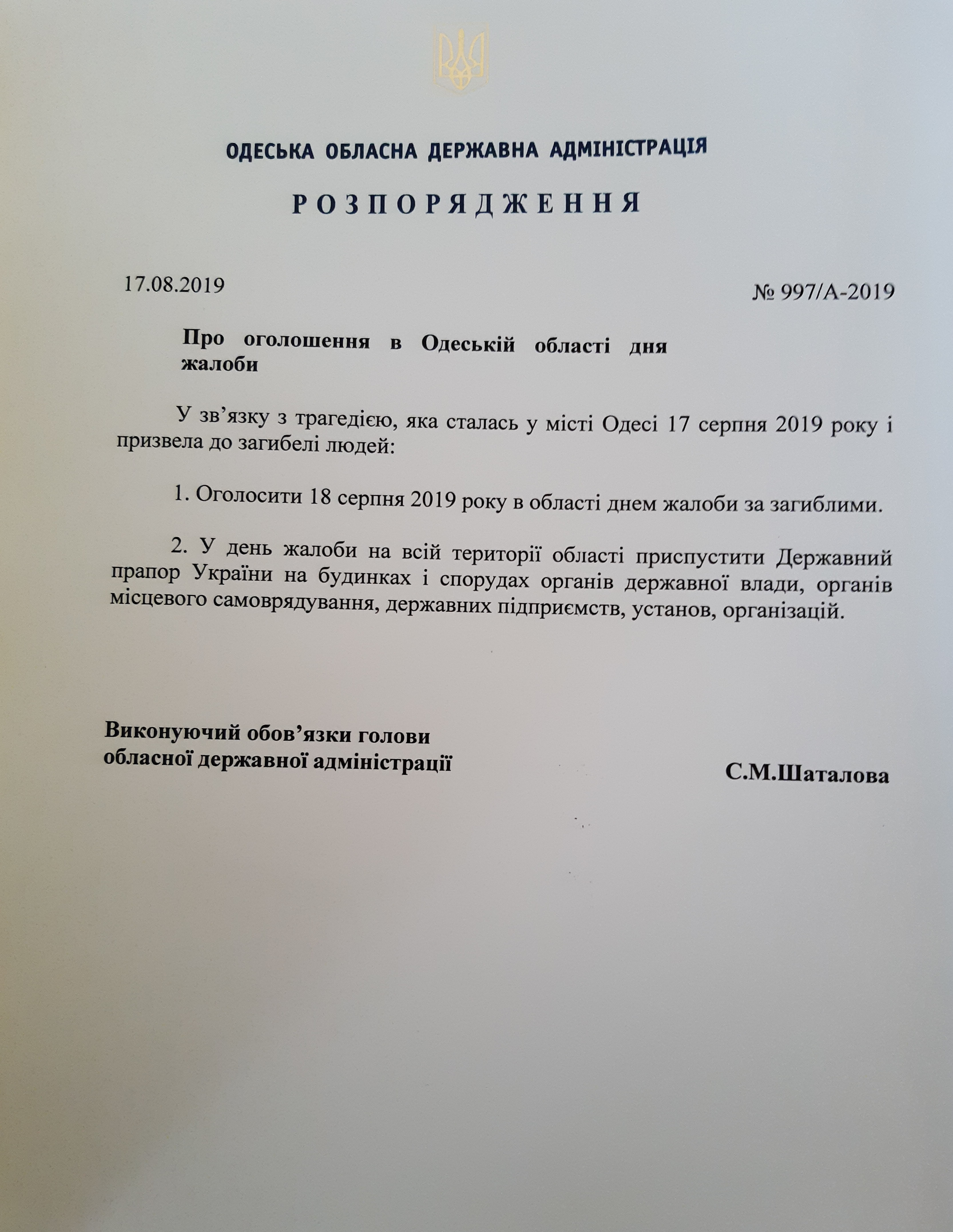 Документ об объявлении траура подписала и. о. главы Одесской облгосадминистрации Светлана Шаталова.