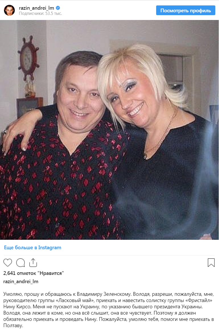 "Меня не пускают на Украину по указанию бывшего президента Украины. Володя, она (Нина. - Ред.) лежит в коме, но она все слышит, она все чувствует. Поэтому я должен обязательно приехать и проведать Нину. Пожалуйста, умоляю тебя, помоги мне приехать в Полтаву", - написал Разин в посте.