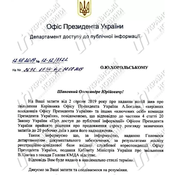 Но в Офисе президента с начала августа стали подолгу не находиться не только заявления членов "команды Зеленого", а и другие запрашиваемые документы. Например, проаносированный самим Зеленским законопроект о рынке земли, а также программа визита и состав делегации, которая сопровождала президента в Турцию 7-8 августа 2019 года.