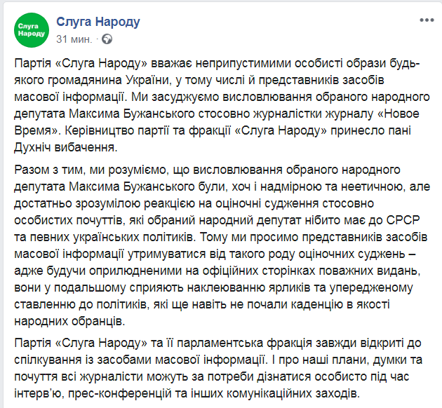 Партия "Слуга народа" принесла извинения за своего члена Максима Бужанского, назвавшего журналистку "Нового Времени" Ольгу Духнич "тупой овцой". Соответствующий пост появился на Facebook-странице политсилы.