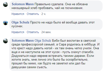 "Биби (так называют Нетаньяху в Израиле - Ред.) был воспитан в светской среде профессорской семьей, а Сара родилась в киббуце (сельскохозяйственная комунна в Израиле - Ред.). ... Додуматься надо евреев встречать такими дарами. Если хотите знать, мне лично это было бы оскорбительно, прошел бы мимо, как будто не заметил или дал бы девушкам самим съесть", - отметил Манн.