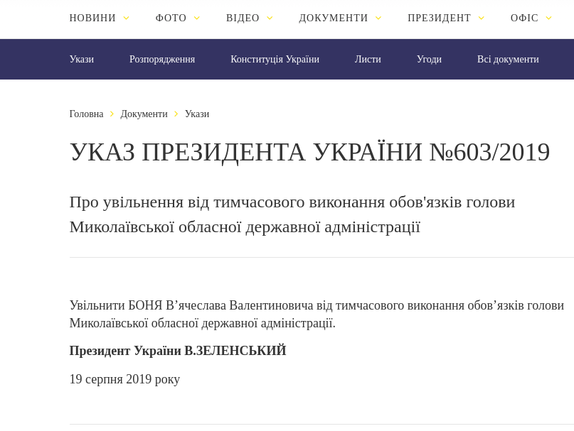 Владимир Зеленский уволил временно исполняющего обязанности главы Николаевской областной государственной администрации (ОГА) Вячеслава Боня. Соответствующий указ №603/2019 от 19 августа 2019 года опубликован на сайте президента Украины.