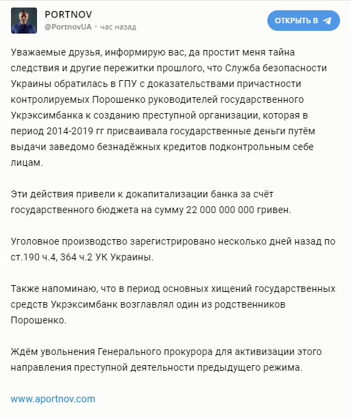 "Уважаемые друзья, информирую вас, да простит меня тайна следствия и другие пережитки прошлого, что Служба безопасности Украины обратилась в ГПУ с доказательствами причастности контролируемых Порошенко руководителей государственного Укрэксимбанка к созданию преступной организации, которая в период 2014-2019 гг присваивала государственные деньги путём выдачи заведомо безнадёжных кредитов подконтрольным себе лицам", - написал он.