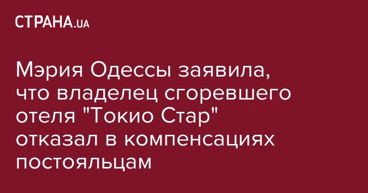 Собственник гостиницы "Токио Стар", при пожаре в которой погибли 9 человек,  бизнесмен Вадим Черный отказался расселять людей после ЧП и выплачивать им компенсацию. Такое заявление сделали в мэрии Одессы. В частности, вице-мэр Павел Вугельман сообщил, что горсовет от имени 63 постояльцев горевшей гостиницы, которые нуждались в материальной поддержке, связались с полицией, спросив о возможной компенсации, и получили ответ, что владелец отеля не будет ничего выплачивать. Об этом сообщает "Думская".