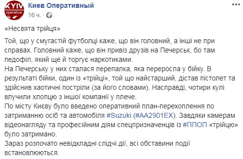 По городу Киеву был введен оперативный план-перехват по задержанию лиц и автомобиля Suzuki (#AA2901EX). Благодаря камерам видеонаблюдения и профессиональным действиям спецназовцев с ППОП участников драки задержали.
