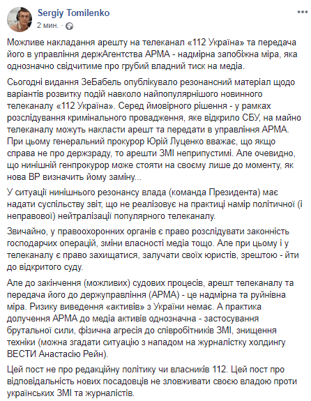 "Сегодня издание TheБабель опубликовало резонансный материал о вариантах развития событий вокруг популярного новостного телеканала "112 Украина". Среди вероятного решения - в рамках расследования уголовного производства, которое открыло СБУ, на имущество телеканала могут наложить арест и передать в управление АРМА. При этом генеральный прокурор Юрий Луценко считает, что если дело не о госизмене, то аресты СМИ недопустимы. Но очевидно, что нынешний генпрокурор может стоять на своем только до момента, как новая ВР определит ему замену", - написал Томиленко.