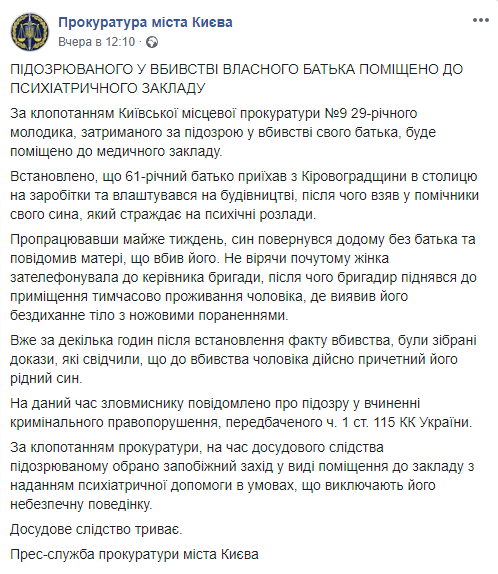 Задержанный по подозрению в убийстве своего отца 29-летний парень по ходатайству прокуратуры Киева будет помещен на лечение в медицинское учреждение. Об этом сообщает пресс-служба прокуратуры столицы в Facebook.