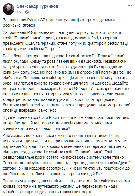 Возвращение России в международный формат стран "Большой семерки" (G7) - окончательно похоронит систему коллективной безопасности в мире. Так считает экс-секретарь Совета национальной безопасности Украины Александр Турчинов на своей странице в Facebook.