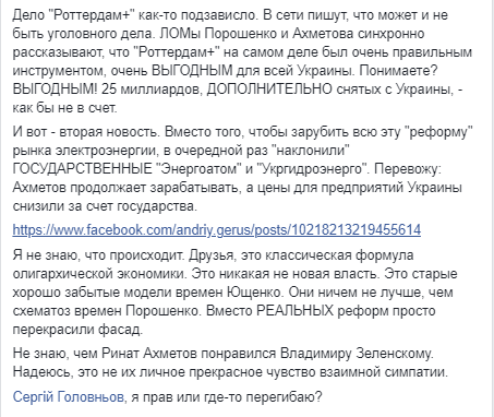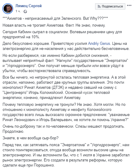 "Все бы ничего, но нетронутой осталась тепловая энергетика. А в этой отрасли, напомню, работают две крупных группы влияния. Это почти монополист Ринат Ахметов (ДТЭК) и недавно севший на схему с "Центрэнерго" Игорь Коломойский. Основной кусок тепловой энергетики, конечно, принадлежит Ахметову", - пишет Лямец.