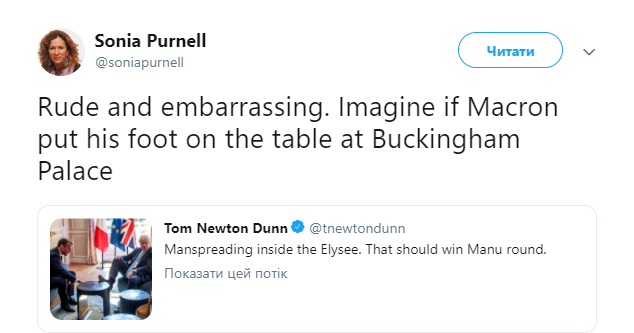 "Представьте, если бы Макрон положил ноги на стол в Букингемском дворце", - написала она в Twitter.