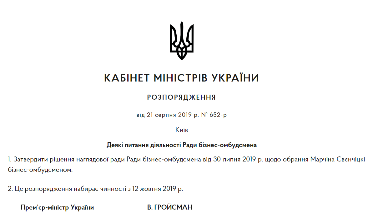 Кабинет министров Украины принял решение о назначении новым бизнес-омбудсменом поляка Марчина Свенчицкого. Официально он вступит в должность 12 октября.