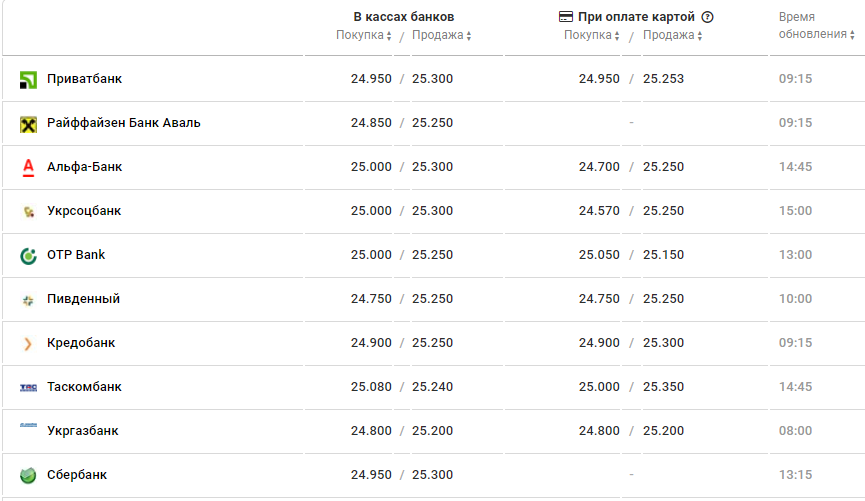 В банках курс доллара с утра был такой: покупка в среднем 25,0 грн, продажа - 25,29 грн. В обед американская валюта ненамного подешевела: 24,96 грн - покупка и 25,25 грн - продажа. Таким же средний курс сохранился и к вечеру.