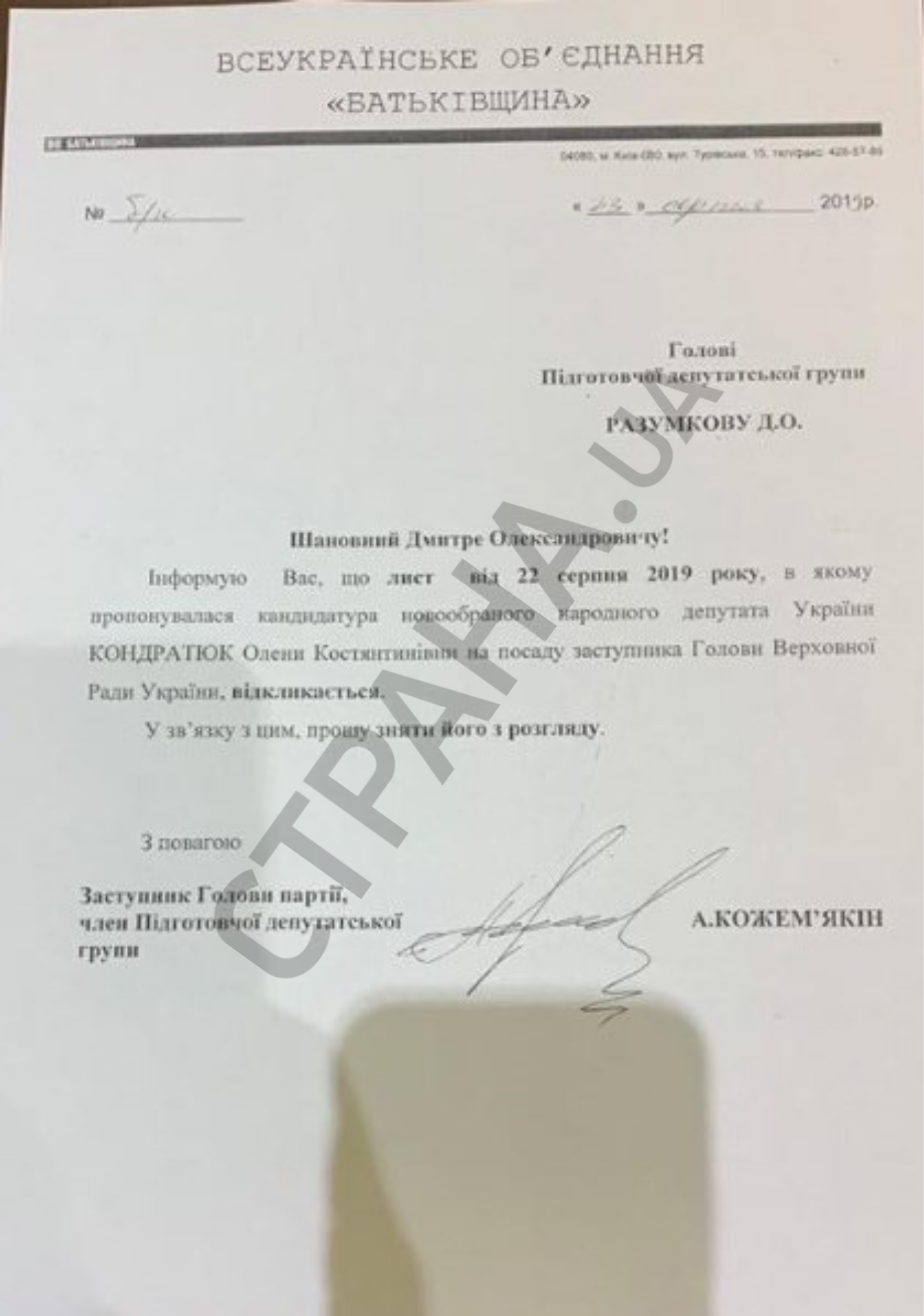 Документ за подписью нардепа Андрея Кожемякина оказался в распоряжении "Страны".