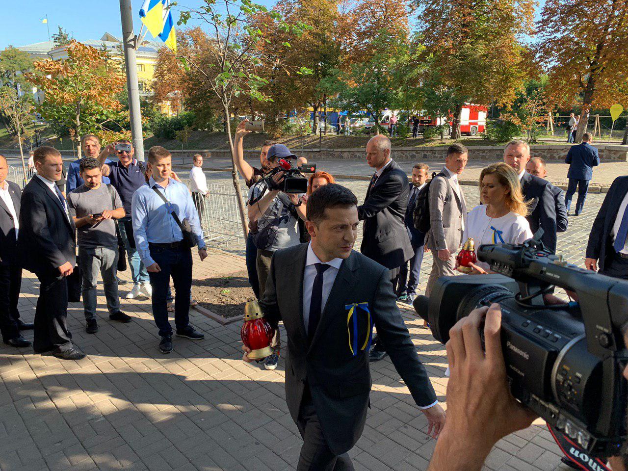 09:14 На Грушевского подъехал президент. Журналисты попросили у Зеленского комментарий, он на секунду остановился, повернулся к прессе и поздравил их с Днем независимости на украинском языке.