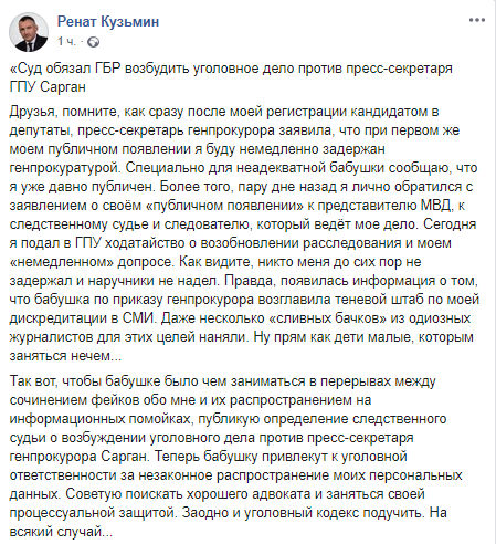 "Суд обязал ГБР возбудить уголовное дело против пресс-секретаря ГПУ Сарган. Друзья, помните, как сразу после моей регистрации кандидатом в депутаты, пресс-секретарь генпрокурора заявила, что при первом же моем публичном появлении я буду немедленно задержан генпрокуратурой. Специально для неадекватной бабушки сообщаю, что я уже давно публичен", — написал он.