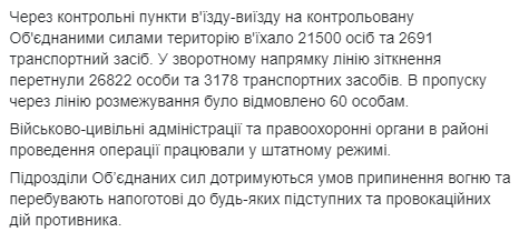 "В течение текущих суток вооруженные формирования Российской Федерации и ее наемники два раза нарушили режим прекращения огня. Противник обстреливал наши позиции в районе ответственности оперативно-тактической группировки "Восток" из станкового противотанкового гранатомета, крупнокалиберных пулеметов и стрелкового оружия", - говорится в сводке ООС.