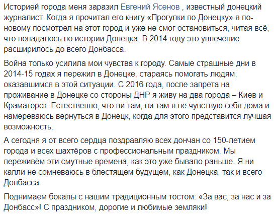 А сегодня я от всего сердца поздравляю всех дончан со 150-летием города и всех шахтёров с профессиональным праздником. Мы переживём эти смутные времена, как это уже бывало раньше. Я ни капли не сомневаюсь в блестящем будущем, как Донецка, так и всего Донбасса.