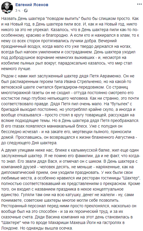 "Назвать День шахтера "поводом выпить" было бы слишком просто. Как и на Новый год, в День шахтера пили все. И, как и на Новый год, никто никого за это не упрекал. Казалось, что в День шахтера пили как-то по-особенному, красиво и благородно. А если кто и нажирался в хлам, то к нему со всех сторон протягивались лучики добра. Вечерний праздничный воздух, когда мало кто уже твердо держался на ногах, всегда был напоен умилением и состраданием. День шахтера уходил под добродушное ворчание немногих выживших - и, несмотря на изобилие пьяных рыл вокруг, парадоксально казалось, что мир стал немного лучше.
