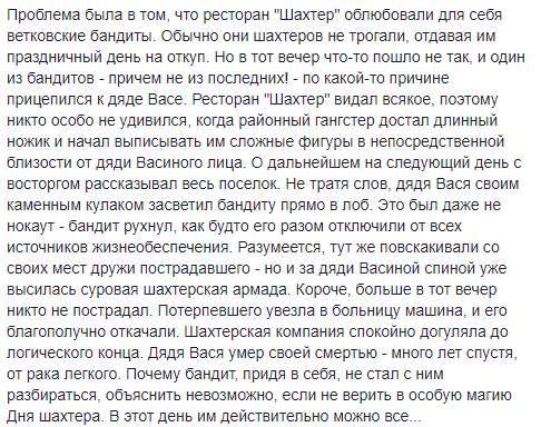 Проблема была в том, что ресторан "Шахтер" облюбовали для себя ветковские бандиты. Обычно они шахтеров не трогали, отдавая им праздничный день на откуп. Но в тот вечер что-то пошло не так, и один из бандитов - причем не из последних! - по какой-то причине прицепился к дяде Васе. Ресторан "Шахтер" видал всякое, поэтому никто особо не удивился, когда районный гангстер достал длинный ножик и начал выписывать им сложные фигуры в непосредственной близости от дяди Васиного лица. О дальнейшем на следующий день с восторгом рассказывал весь поселок. Не тратя слов, дядя Вася своим каменным кулаком засветил бандиту прямо в лоб. Это был даже не нокаут - бандит рухнул, как будто его разом отключили от всех источников жизнеобеспечения. Разумеется, тут же повскакивали со своих мест дружи пострадавшего - но и за дяди Васиной спиной уже высилась суровая шахтерская армада. Короче, больше в тот вечер никто не пострадал. Потерпевшего увезла в больницу машина, и его благополучно откачали. Шахтерская компания спокойно догуляла до логического конца. Дядя Вася умер своей смертью - много лет спустя, от рака легкого. Почему бандит, придя в себя, не стал с ним разбираться, объяснить невозможно, если не верить в особую магию Дня шахтера. В этот день им действительно можно все...".