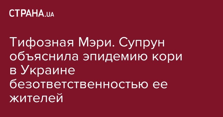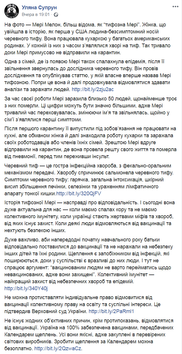И.о. министра здравоохранения Ульяна Супрун рассказала украинцам о знаменитом примере безответственного отношения к здоровью окружающих из американской истории и попросила граждан вакцинировать своих детей. Соответствующий пост чиновница опубликовала на Facebook.