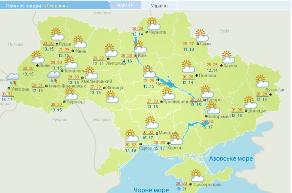 27 августа в Украине будет так же жарко, как и в понедельник. Воздух как следует прогреется даже в двух западных регионах, где весьма вероятны осадки. Во всех областях столбики термометров поднимутся выше +26 градусов Цельсия. Днем прохладнее всего будет в Сумах (до +27). А жарче всего - в Ужгороде, Николаеве и Одессе (до +32 градусов).