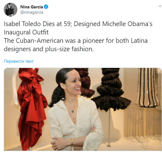 В США умерла американский дизайнер кубинского происхождения Изабель Толедо, которая создала знаменитое платье-футляр для бывшей первой леди США Мишель Обамы, в котором она появилась на инаугурации своего мужа Барака Обамы в 2009 году. Об этом сообщает Associated Press.