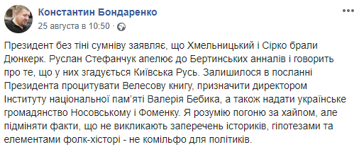 "Президент без тени сомнения заявляет, что Хмельницкий и Сирко принимали Дюнкерк. Руслан Стефанчук апеллирует к Бертинским анналам и говорит о том, что в них упоминается Киевская Русь. Осталось в послании процитировать Велесову книгу, назначить директором Института национальной памяти Валерию Бебик, а также предоставить украинское гражданство Носовскому и Фоменко. Я понимаю погоню за хайпом, но подменять факты, которые не вызывают возражений историков, гипотезами и элементами фолк-хистори - не комильфо для политиков".