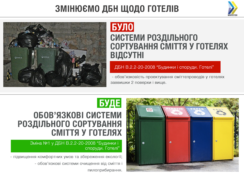 Обязательные требования по устройству современных систем раздельной сортировки мусора при проектировании новых или реконструкции существующих зданий гостиниц содержатся в новых изменениях в государственные строительные нормы. Об этом сообщил заместитель министра регионального развития, строительства и жилищно-коммунального хозяйства Украины Лев Парцхаладзе на своей странице в Facebook.