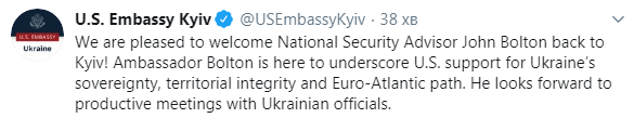 "Мы рады приветствовать советника по национальной безопасности Джона Болтона в Киеве! Посол Болтон здесь, чтобы подчеркнуть поддержку США суверенитету, территориальной целостности и евроатлантическому пути Украины. Он с нетерпением ожидает продуктивных встреч с украинскими чиновниками", - говорится в опубликованном сообщении.