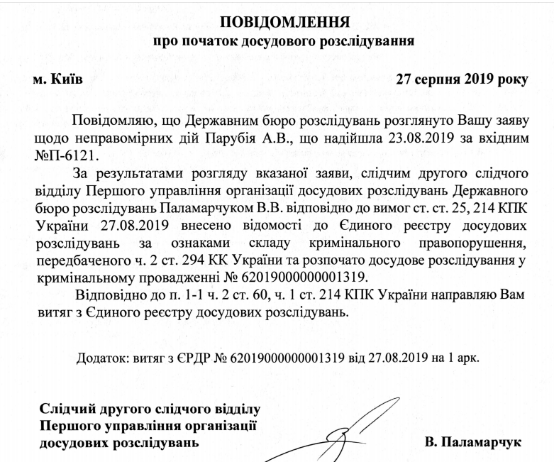 "Парубий А.В. в 2014 году, занимая должность секретаря СНБО, с целью организации массовых беспорядков, организовал создание подконтрольных ему гражданских группировок, которые действовали на территории Одесской области, которые действуя по указанию последнего учиняли массовые беспорядки, которые сопровождались насилием над лицами, сопротивлением представителям власти с применением оружия и других предметов, которые использовались как оружие та повлекли тяжелые последствия", - говорится в материалах уголовного производства.