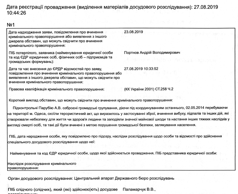 В Государственном бюро расследований открыли три уголовных производства против экс-спикера Андрея Парубия по факту массового убийства людей в одесском Доме профсоюзов 2 мая 2014 года. Соответствующие документы опубликованы в телеграм-канале юриста Андрея Портнова.
