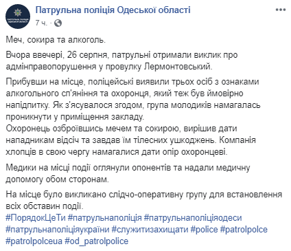 Вечером в понедельник, 26 августа, в Одессе охранник санатория Министерства обороны "Одесский", вооруженный мечом, подрался с тремя мужчинами, которые пытались пробраться на территорию заведения.