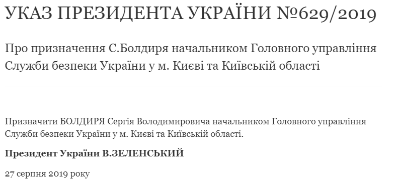 Новым главой управления СБУ в Киеве и области был назначен Сергей Болдырь. Соответствующий указ президента Владимира Зеленского размещен на официальном сайте главы государства 27 августа.