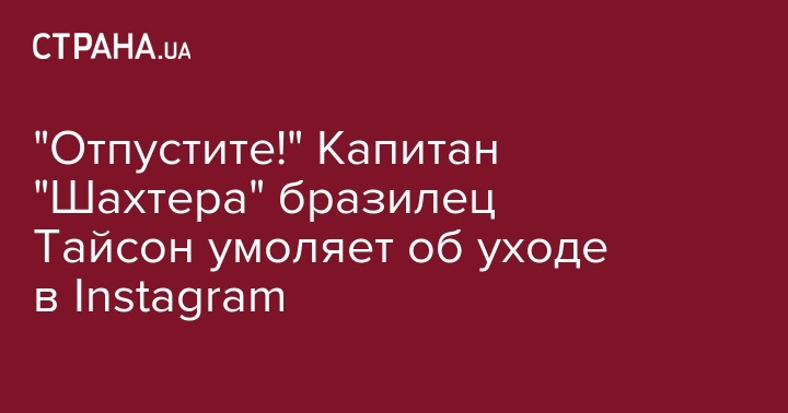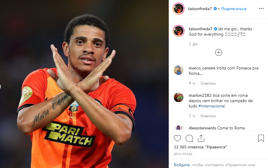 Бразильский капитан донецкого Шахтера Тайсон, в покупке которого недавно заинтересовался итальянский клуб "Рома", попросил его отпустить. Соответствующий пост футболист опубликовал в Instagram.