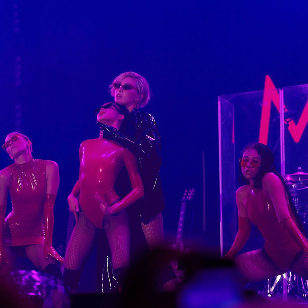 Девушка с шоу-балетом выступала в латексной одежде. MARUV была одета в черное латексное кимоно с разрезами по всей длине ног. Ее танцовщицы выделялись на сцене провокационными нарядами из красного латекса.