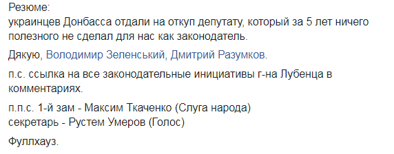 Резюме: украинцев Донбасса отдали на откуп депутату, который за 5 лет ничего полезного не сделал для нас как законодатель.