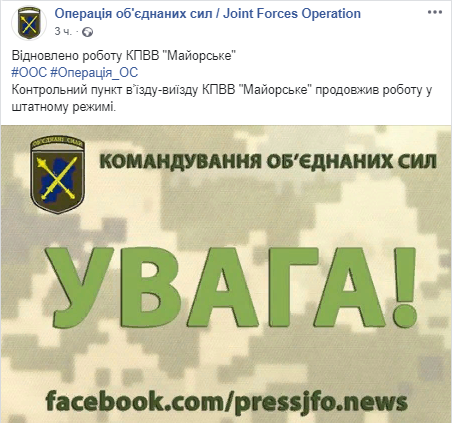 "Контрольный пункт въезда-выезда КПВВ "Майорское" продолжил работу в штатном режиме", - говорится в сообщении.