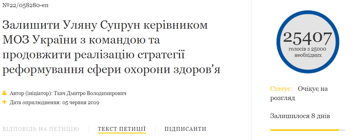 Опубликованная на сайте президента Украины петиция о сохранении и.о. министра здравоохранения Уляны Супрун главой ведомства набрала необходимые для рассмотрения 25 тысяч. Счетчик голосов показывает цифру 25407.