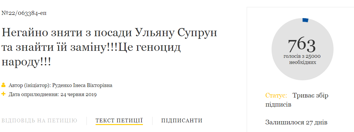 Между тем "Страна" насчитала на сайте около 30 петиций с требованиями отстранить Супрун (а в одной автор даже просит депортировать ее в США). Однако они не набрали необходимого количества голосов.