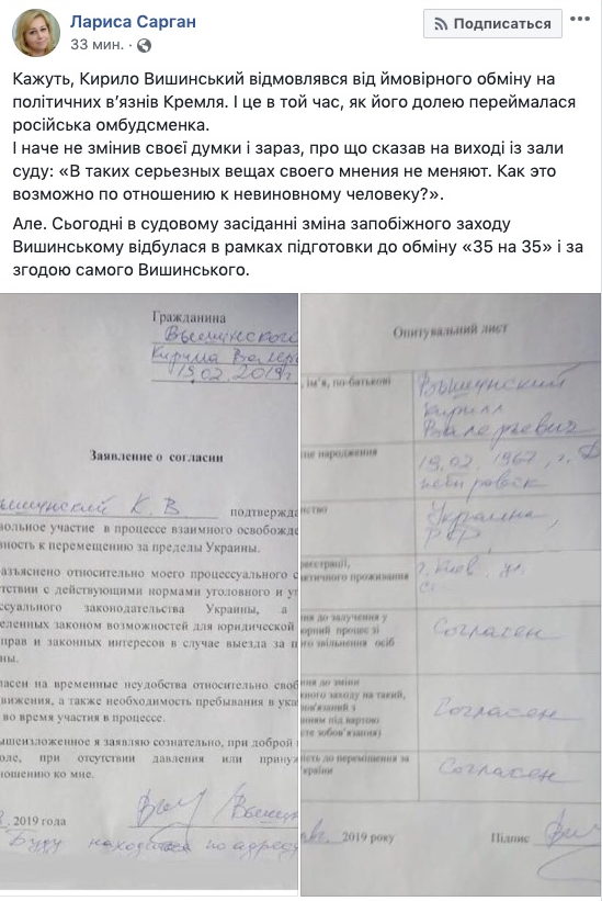 Главный редактор РИА Новости-Украина Кирилл Вышинский якобы подписал заявление о согласии на обмен. Об этом сообщила в Facebook пресс-секретарь генерального прокурора Лариса Сарган, но вскоре удалила этот пост.