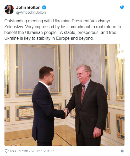 Говоря о встрече с украинским президентом Владимиром Зеленским, Болтон назвал ее "замечательной".