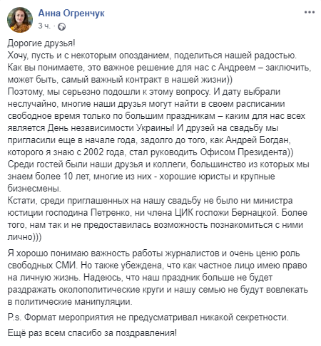 "Дату выбрали неслучайно, многие наши друзья могут найти в своем расписании свободное время только по большим праздникам – каким для нас всех является День независимости Украины! И друзей на свадьбу мы пригласили еще в начале года, задолго до того, как Андрей Богдан, которого я знаю с 2002 года, стал руководить Офисом Президента", - говорится в посте.